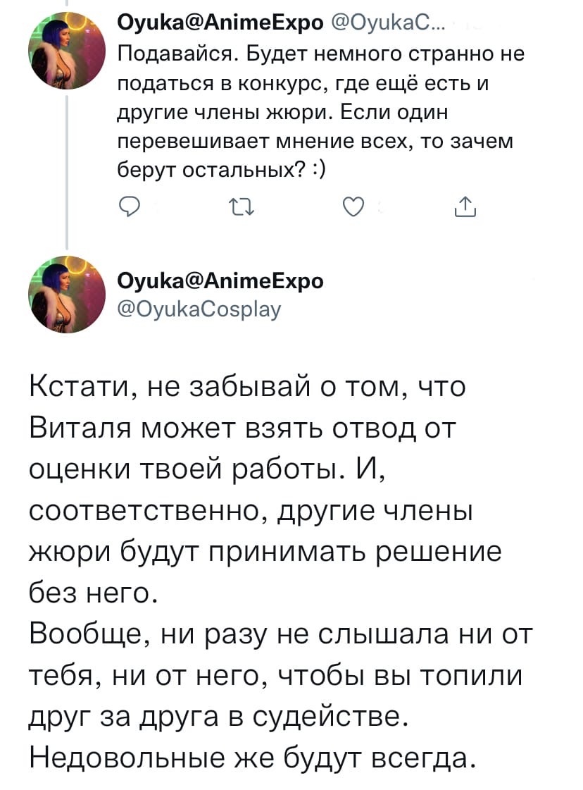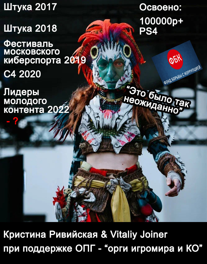 Ривийская конечно весьма неприятный человек, но, к вопросам о победах - может быть дело не только в ней, а в конкуренции в целом низкой в конкурсах? Сейчас большая часть косплееров перешла или на домашний тикток-контент или на торговлю нюдсами на патреон-онлифанс, а уж в онлайн-конкурсы многим просто влом подаваться, в итоге - а кто вообще конкуренты? всякое днище типа Савостьянова с его говно-МК? Заказанные в студиях штурмовики и мандалорцы?