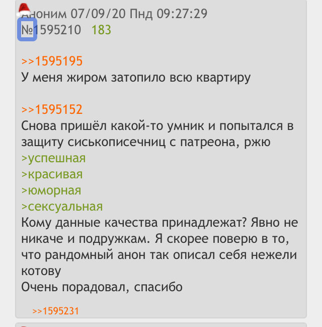 >>1626126 Анон, я кстати без толики скромности скажу, что вообще на мне этот тред и держится. Я этого никогда не скрывал и уже кажется написал, что троллить карланиху для меня первостепенно, а вас, жалких, унизить - второстепенно. Нет, даже третьестепенно потому что видит реакцию патреоншиц в их конфе бесценно. Нику оттуда давненько кикнули и сейчас ана чу и прочие весело и звонко смеются с фотошопа, кидая в конФу фотки из этого треда. Моя цель обличить ее, но тактика простого постинга в стиле "вот смотрите здесь она токсичная, а вот здесь лицемерит" профита не принёс. На тред РЕАЛЬНЫЕ люди обратили внимание тогда, когда там появился "симп"