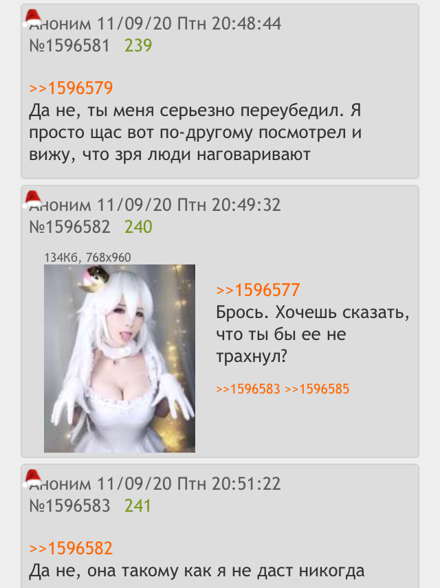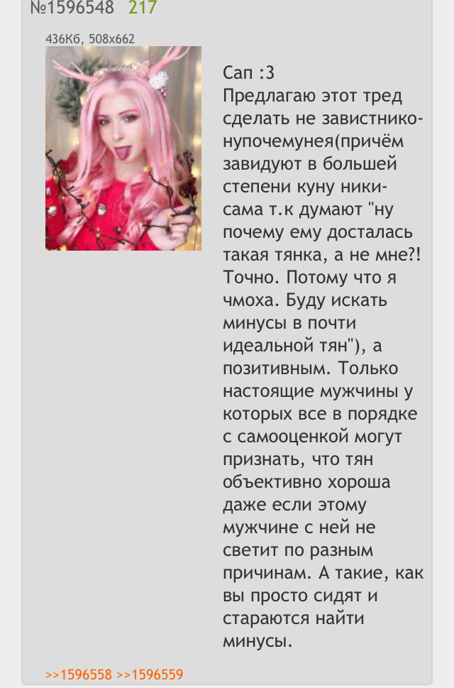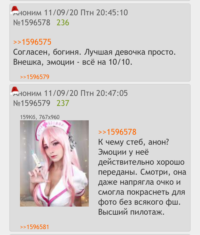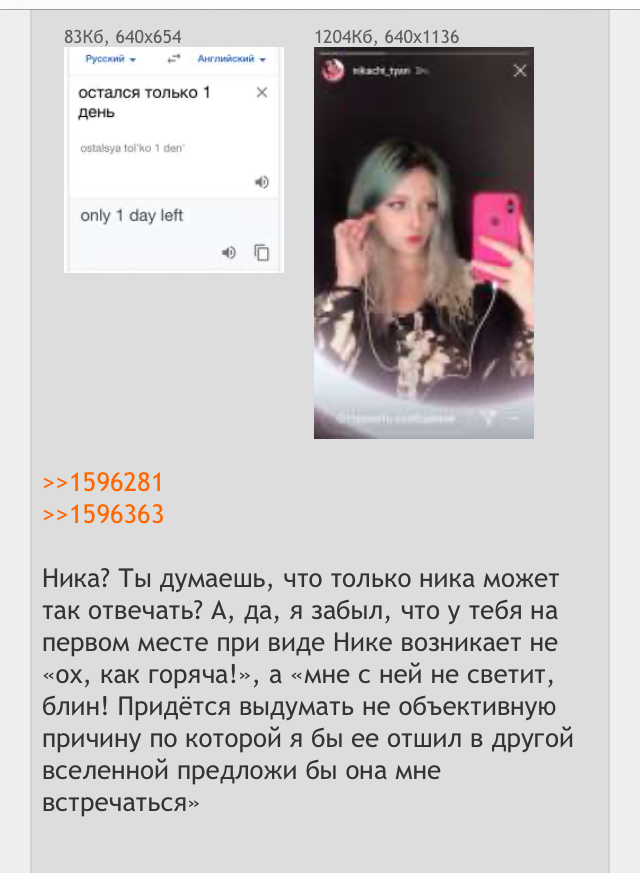 >>1627345 Не во всех. Лишь в этом, анон. Тем более ты не смотришь на контекст ситуации. Я изначально была вполне себе адекватной, а потом лишь подыграла: анон выше доконал меня шутками про гомосексуальность, что уже просто захотелось согласится и посмотреть на его реакцию. А "отмечаться" в тредах я начала после того, как многих анонов называли "моим" прозвищем за поддув косплеерам. Уж не знаю чем вас всех так задели пасты про Никачи, но даже если бы она мне нравилась, то абсурдно было в целом начинать этот цирк. Про "оживление" я утрирую... очевидно, что это лишь толика какого-никакого веселья, а так раздел как был посвящён эскортницам в париках, так и продолжает. После моего ухода ровным счетом ничего не изменится - я просто буду уже в других, тонущих тредах про мастеров и прочие осколки первоначальной сути этой доски.