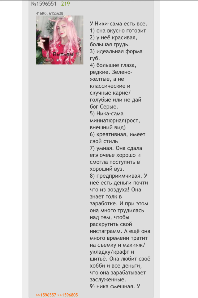 Тред имени великой Никачи Тян Вероники Дубининой №3 Никто не ждал, никто не желал и никто не жалует, но богиня проломила своей 10/10 тушкой Гугл с запросом "ника котова" и спустилась на двачи Далее рьяно принялась обсасывать каждый тред в предыдущих Предыдущие >>1592943 (OP) (OP) >>1603467 (OP) Мы услышали, Ника! Краткая инфа: Ника Котова родилась 2001. Социофобка(ведущая образ жизни социобляди), ТОЖЕ двачер, боротится с ожирением таблетками и вот-вот приведёт себя в норму: возьмёт пример с 0лисы, начнёт активно сжимать жиры, но менее палено(честн слово!) Все ее обижают, она добрая. Она милая. Она твоя цундере. Люби ее и жалуй А ника взамен даст нюхнуть ножку<3 бери пример с адрестраха