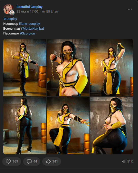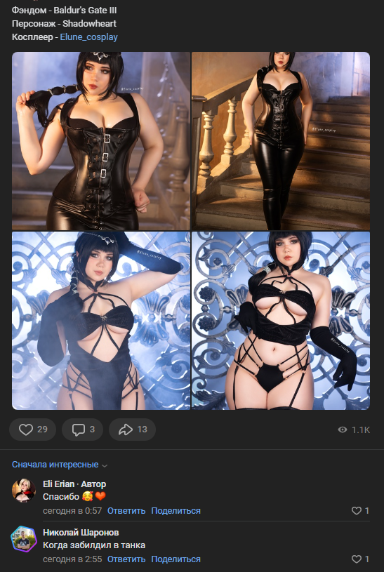 Доброго дня. Давеча вели беседу с учеными анонами о косплейщице Дарья Флора https://2ch.hk/fd/res/1663858.html#1664334 и мимолетом наткнулись на ее подружку по ремеслу. Зовет она себя Eli Erian. Пышечка конечно на любителя, но в отличие от своей коллеги она не стесняется демонстрировать свои телеса без цензуры о чем она с гордостью заявляет на своих страницах. Покидайте топового контента, нюдесов в общем кто на что горазд.