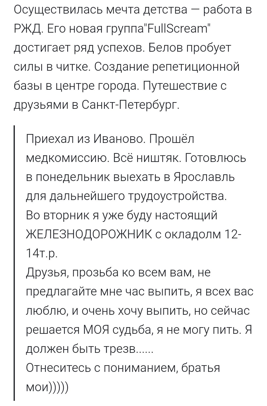 А случай Белова довольно типичен для провинции в России, спившийся диджей, рокер, поэт, который стукнулся о свою наивность и оказался в своей провинциальной ловушке, так и не выбравшись никуда за её пределы из-за тупого окружения и отсутствия адекватных друзей.