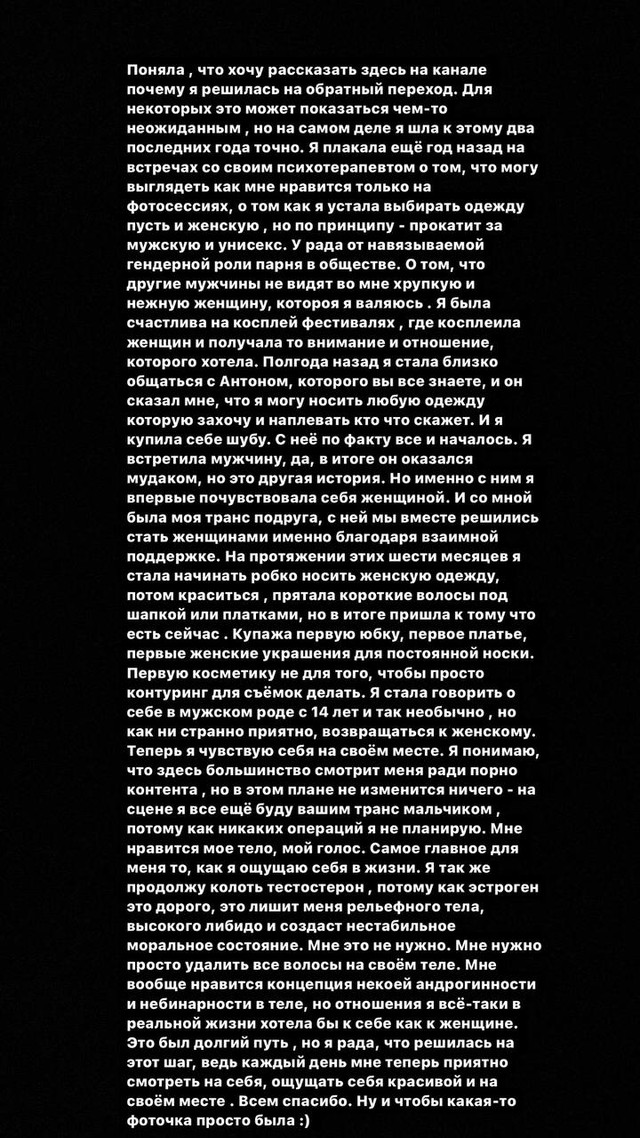 >>1692329 Простыня с объяснениями и срач с каким то куном (общественность поняла так, что с куном были совместные "проекты" (то есть фотки с клитором и хуем наперевес), типа отношения, а потом он Грушу кинул через хуй. И она осознала в себе женщину-трапа).