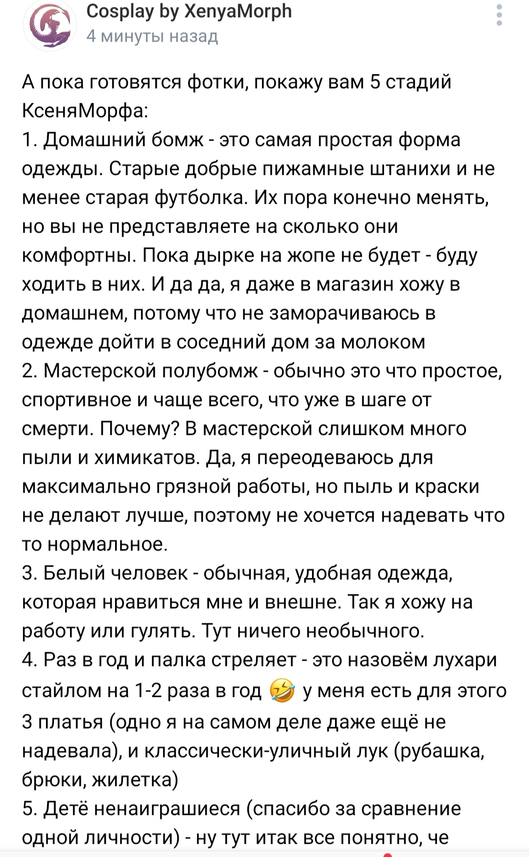 Не, ну раз сама себя бомжихой называешь, да ещё уже который раз пишешь пост о своих бомжатских шмотках, значит действительно бомжара обосанная. Все запомнили? Нет, давайте ещё миллиард раз прочтем, как Ксеноморфа любит одеваться как бомжара подзаборная. Ну а по факту: нахуя нам это знать? Зачем она это пишет? Видимо тянет время, пока нет косплея, что б заполнить группу всякой поеботой.