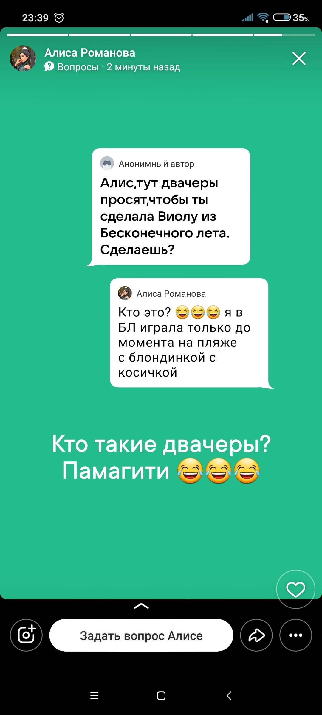 Мне кажется, что Алиса ведет какую-то странную игру. С одной стороны подружкайка Ойчи, с другой-тусит с Ксюшей, которую ебет Леша Травкин, который раньше ебал Ойчу. Возникает масса вопросов: использует ли Вера Алису, чтобы поднасрать Травкину, благодаря которому все узнали, что Вера работала (работает?) в стрипклубе; или же Травкин через Ксюшу (тред про нее имеется по соседству) пытается с помощью Алисы поднасрать Вере? Много вопросов и ни одного ответа