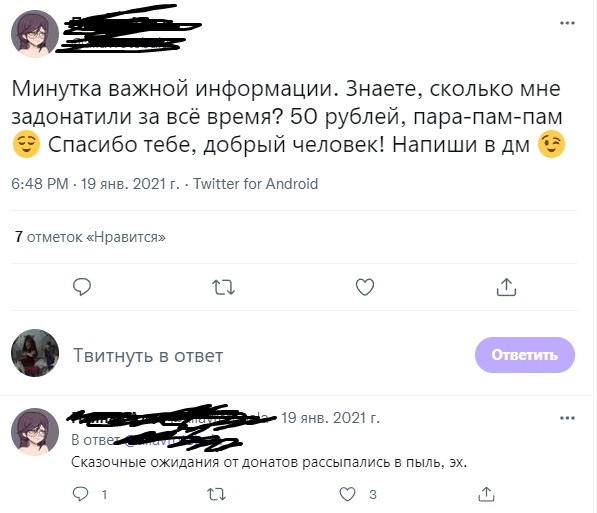 >>1719260 Еще, все яойные принцы, пытающиеся щас заработать на бустях, забывают что тянки, которые нализывают им в комментах не любят донатить. А если и донатят, то по 100 рублей с завтраков.