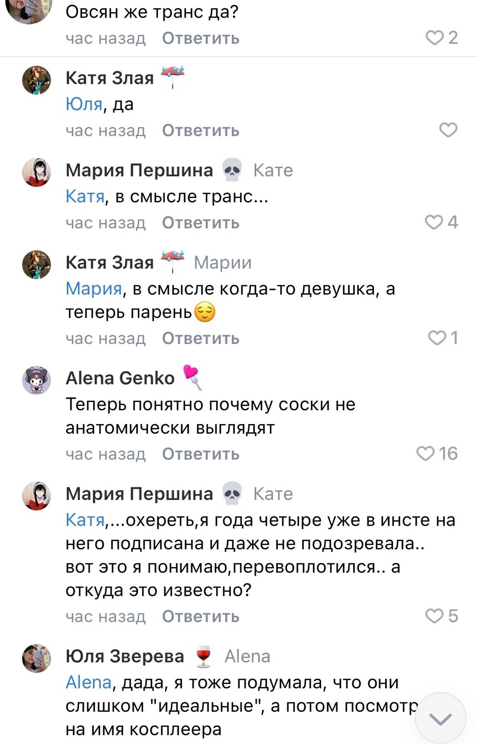 Короче, ты сказал все плюс-минус верно, но чтобы знать, надо знать. В общем, эти две шаболды в свое время были не просто очередными фриками, они были чуть ли не парой самых популярных и главных личностей в фд. Реально. Это было время до сисек и патреона, и эта их гендерная интрига будоражила умы двача почище тайного очка кристины финк. Любому дебилу была понятна половая принадлежность сабжей, однако в виду своей отбитости они до последнего настаивали на том, что они тру-цис-гипер-ващще из маминой вагины парни. Уже ближе к закату истории, внезапно! Итиить пилит видео о том, что он нифига не взрослый поринь, сдающий сессии, а обычная 18-летняя мелкошваль, и только начинает переход. За ним подтянулась овсянка. Примерно через год после этого, Итить уехал из РФ, забил на косплей и пропал с радаров, овсянка переключилась на возникшую из ниоткуда чуть ранее ширку (которая в то время тоже корчила из себя тру-пориня), и стала совместно зарабатывать деньги на симпах.