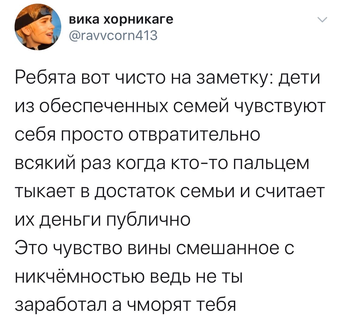 Вспомнила просто, как она года 2-3 ныла в твиттере, что нищеброды смеют пиратить и смеют попрекать её богатством родителей (там ещё был какой-то твит, что одноклассница вики позавидовала её тапкам гуччи за 50к, и вику это оскорбило. не найду его, потерла видимо)