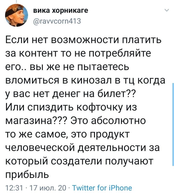 >>1728863 Почему она сравнивает это с просмотром кино или кражей одежды? Предположим, что я пришел в магазин и заплатил за, не знаю, сникерс. Потом ко мне подходит кореш и говорит - "Бро, я жрать хочу, угостишь?". Мне ему что ответить, что он пидарас такой урод, фирма деньги на производство тратила а я тут его бесплатно угощаю? То, что ее контент сливают, не значит, что за него не платят. Кто-то ведь его берет, а потом просто делится со всеми. Другое дело, что люди видят потом качество данного контента и не желают за него платить. Вот я ведьмака 3 спиратил, поиграл и мне пиздец зашло настолко, что я купил его на пк, пс и на свитч в придачу. Потому что я увидел контент и он мне понравился, после чего у меня появилось желание отплатить копейку тем, кто его создал. А контент Вики - говно обычное, за которое платить не хочется :3