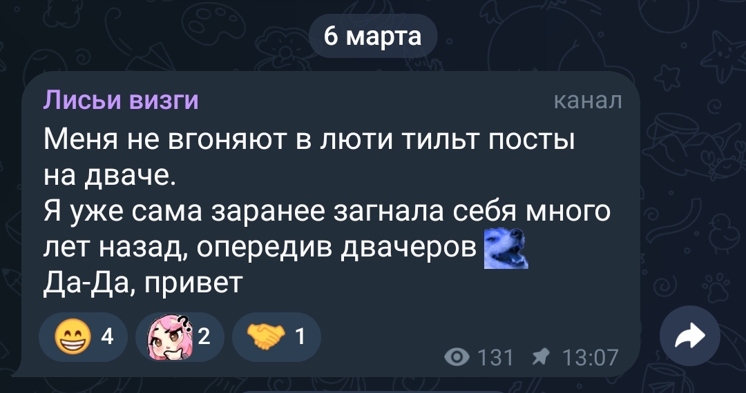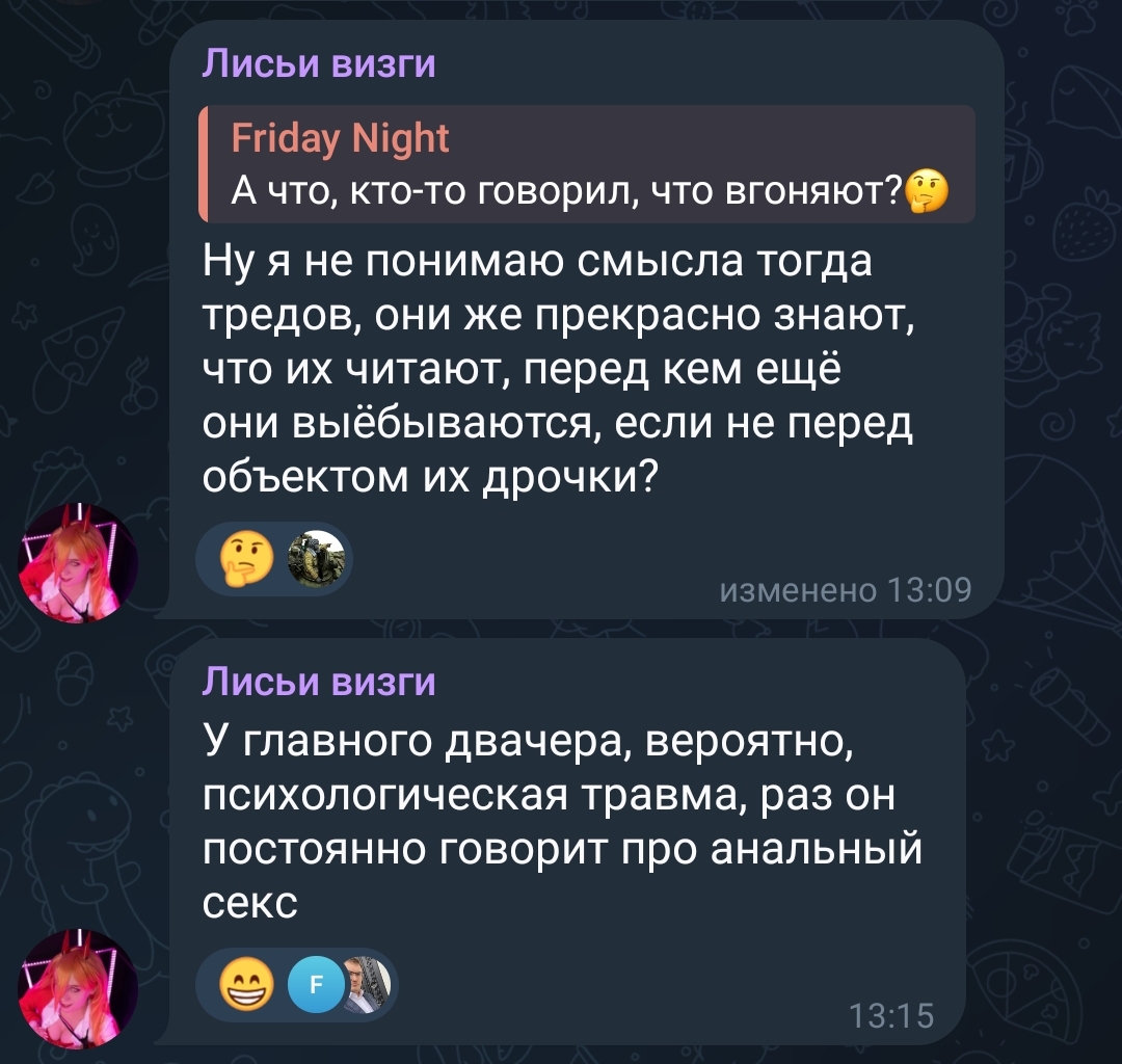 Спасибо анонам, из этого треда мы извлекаем ценный урок, о котором так легко забыть в пылу страсти: у каждой даже самой безнадежной шмары был потенциал стать кем-то большим, возможно даже нормальным человеком. Аноны, да будет душа ваша шире раздолбанного лисьего очка! Аминь
