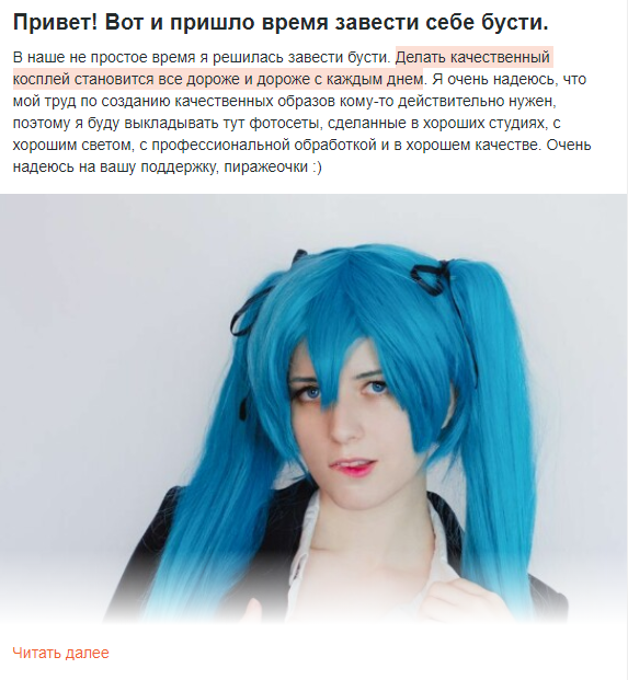 N лет назад гг, тогда еще старшеклассница, увлекается аниме, начинает заниматься косплеем. Пилит видеоблог, не для денег, а чисто для фана. Потом подворачивается Бесконечное Лето, фестиваль по нему, куда она едет косплеить. Ее видеоблог выстреливает и набирает определенную популярность. Она начинает раскручивать видеоблог и другие соцсети. И вообще делает косплей и вот это все своей профессией. Денег это особо не приносит, но она выходит замуж за лошка, который ее обеспечивает.