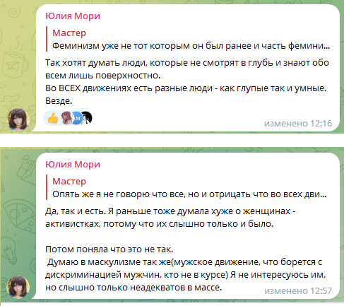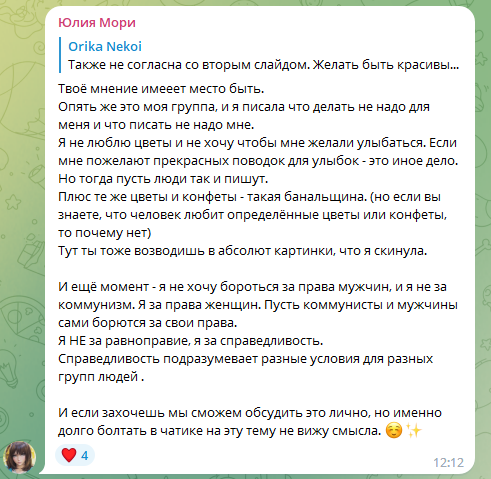 Я ценю каждую женщину в этом мире, даже если мы ругались, даже если я злодейка в ваших глазах, я ценю ваш вклад этот мир!
