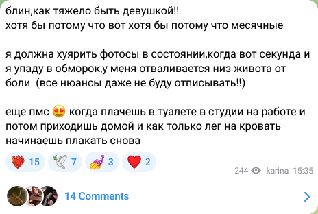 Как ей объяснить, что её фотки в одежде не особо интересны людям, в отличии от фоток, где одежды минимум? Нет, серьёзно, её фото в нижнем белье имеют в инсте по 8-12к лайков, а в одежде по 2-3. Это не "ШаДоУ БаН", это - Карина зарекомендовала себя как торговка телом