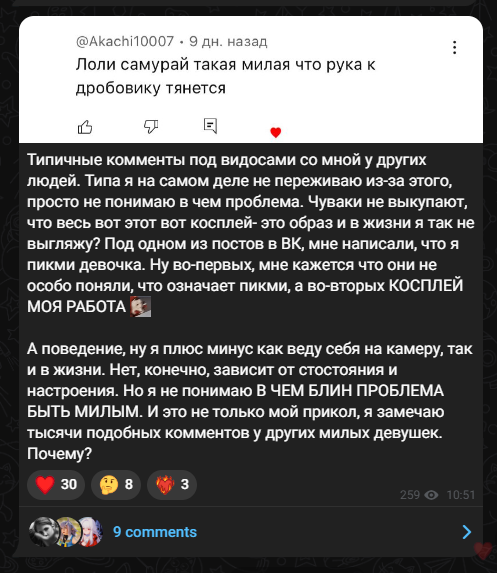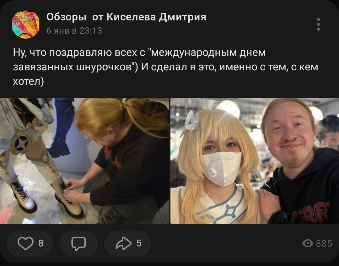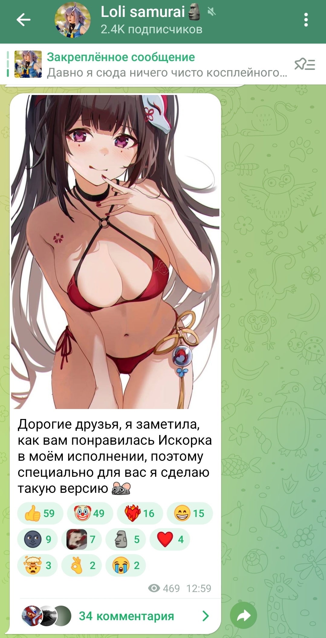А вообще ирония дикая, лоля делает обий косплей с сиськосплейщицей, которая потом выкладывает свою часть образа с меньшим числом одежды, при том сама лоля вся из себя целомудренная. Мб это пройдёт.