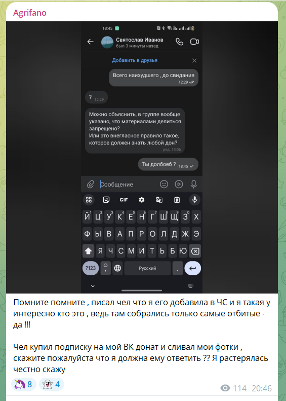 молодой человек, позвольте спросить, почему сливы всё ещё не на дваче? и как вы умудрились спалиться? вы глупый или что? вам трудно скачать фото и отправить сюда, оставаясь доном?