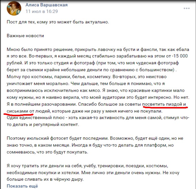 >>1774936 На самом деле бред, что не стали так же следить за теми, кто продает фотки пизды и сисек, хотя могли бы так же, как читали вскукареки всяких бодлерш и им подобных. А так отказали как хорошим косплеерам, которые только канон делают, i_chios например, так и тем, которые фотки с пиздой даже не прикрывали, та же Флора с пидруженьками.