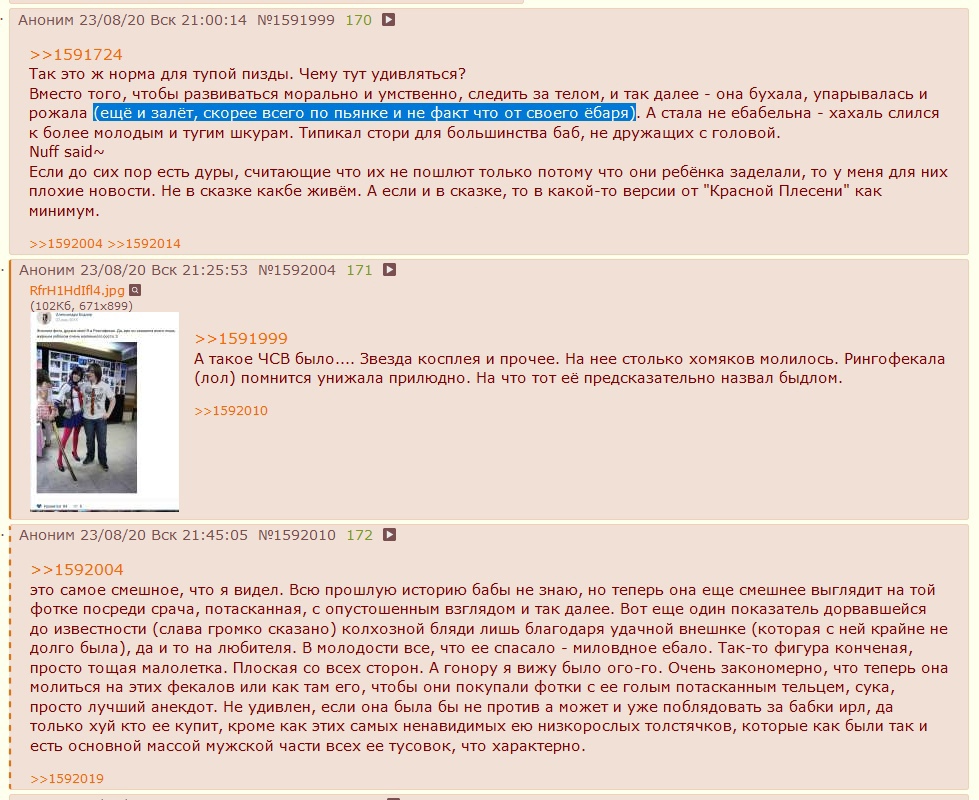 Вам с таким слогом книги писать нужно, а не комменты в 2че. По поводу данного персонажа могу пояснить следующее: общался как то с ней, очень неприятное хабальское отношение. Как 90% вагинонесущих живет в своем пизданутом мирке. Понимаю психологию таких сущностей - обсуждение ее недостатков для нее крайне болезненно. И когда я увидел коммент про пятку, понял, что все сделал правильно. 99% она мониторит сей ресурс.