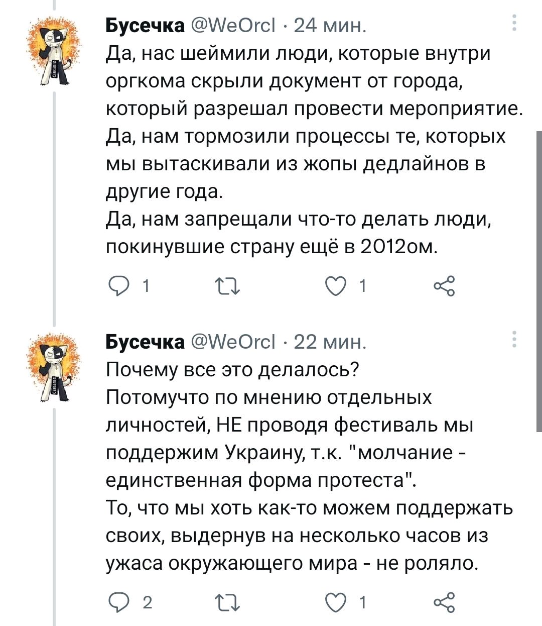 Или оставшиеся орги изгоняют соников и мерлинов ссаными тряпками, лишают всех плашек, убирают их высеры про этичность с официальных ресурсов феста и публично извиняются, или одно из двух.