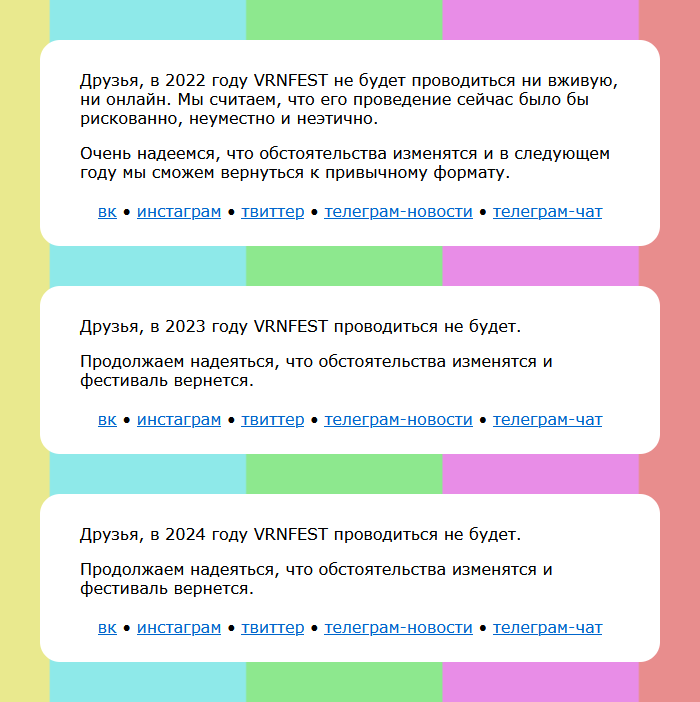 В прошлом году было какое-то микроскопическое сборище от врнфеста, которое смотрелось именно как попытка обозначить "это мы, это наши даты, ля-ля". Но в этом уже что-то не видно. Похоже на то, что действительно потерян интерес, иначе бы хотя бы онлайн какой-нибудь замутили с прямыми включениями.