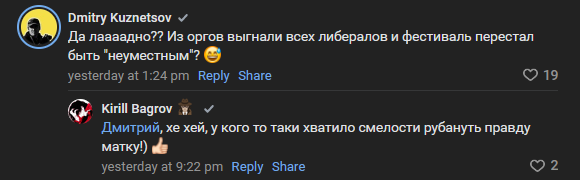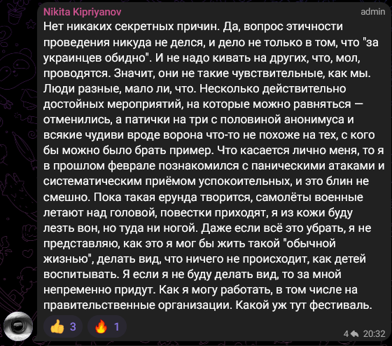 Не за это их шеймят, отнюдь. А за невнятную риторику типа "проводить фестиваль неуместно" и за позицию собаки на сене - сам проводить не буду и другим не дам.