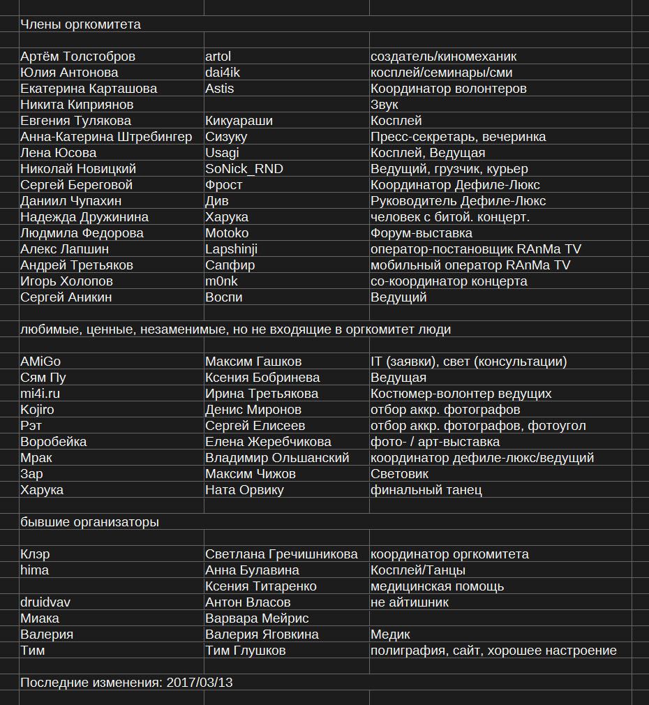 Кроме того, "блатники" имели возможность "вписаться в программу" сразу после запуска системы заявок на очередной год. Общий приём мог быть ещё не открыт, а рыбы вида "сценка Астис про космос", добавленные кем-нибудь из оргкома, в системе уже висели. То есть Усага заранее представляла, с чьими высерами будет возиться.