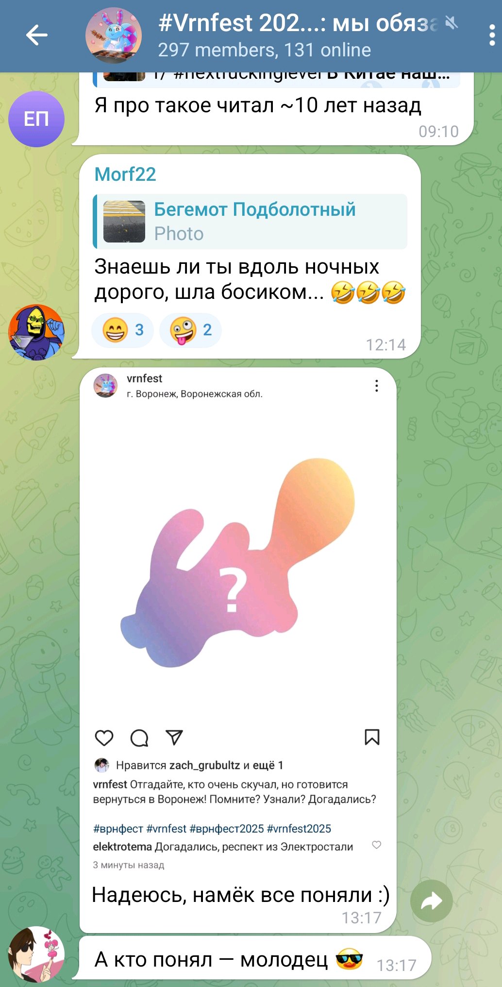 Я не оправдываю сам подход. Тогда мне было пофиг, но сейчас я понимаю, что это было своего рода кумовство. Но вытекало это кумовство не из желания везде протащить своих, а потому что в своих можно было быть уверенными заранее: что они могут выдать минимум, что с ними не придется много ебаться на прогонах, пытаясь превратить кал в шоколадку, что у них нормальная задумка сценки, а не кринж. И потом, Воронеж уже тогда был в первую очередь "фестиком для своих". Круг этих "своих" был шире, чем можно подумать, читая тред на дваче, но он был уже, чем вся аудитория феста, ессно. Там в этом круге своих были еще внутренние всякие круги прям "своих-своих" и так далее.