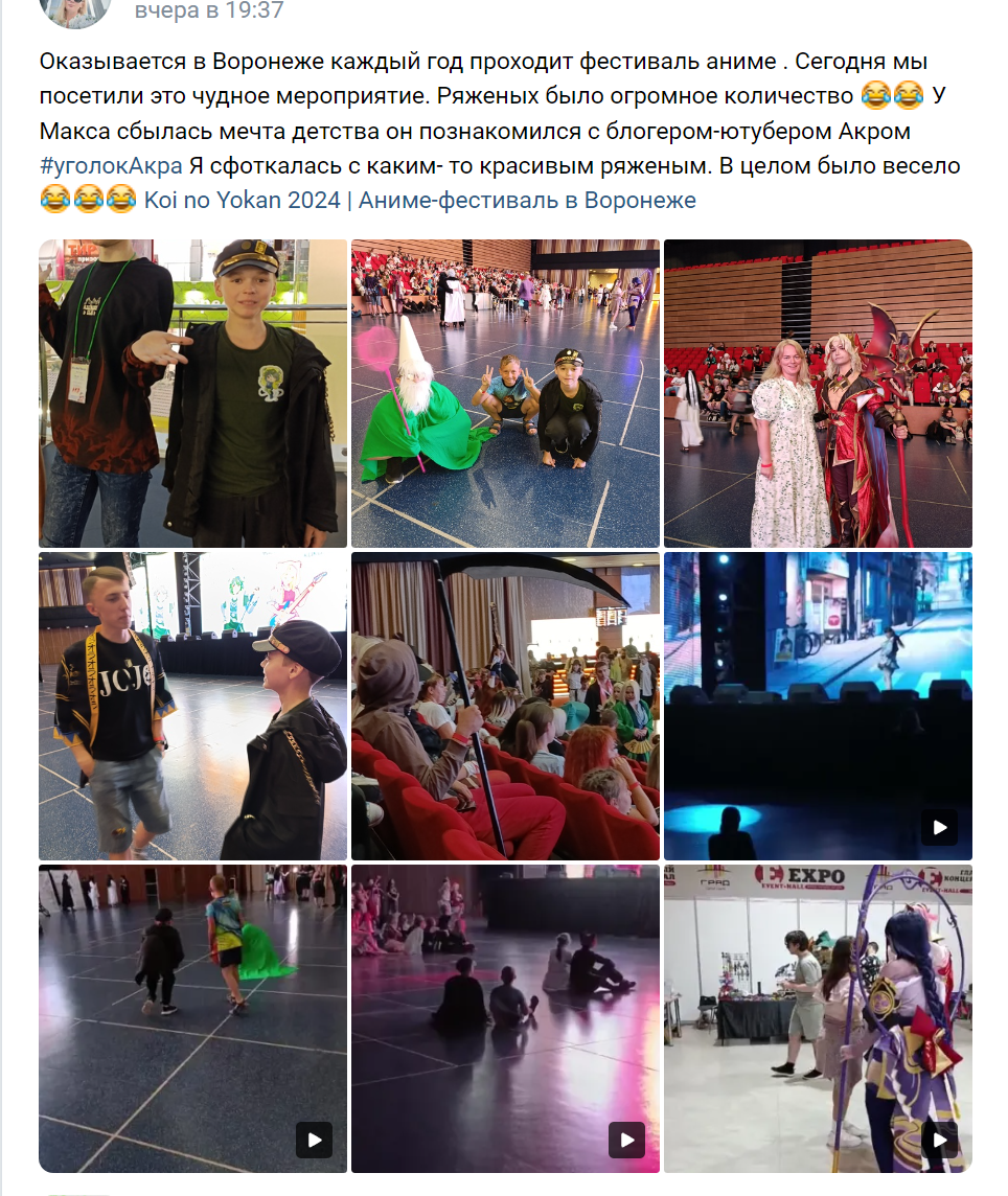 Помню как в 12 году был в Воронеже у родственников, решил прогуляться по городу и случайно наткнулся на этот фест, это было сюреалистично, так как в те временна я понятия ни имел что такое косплей и кто такие косплейрки.