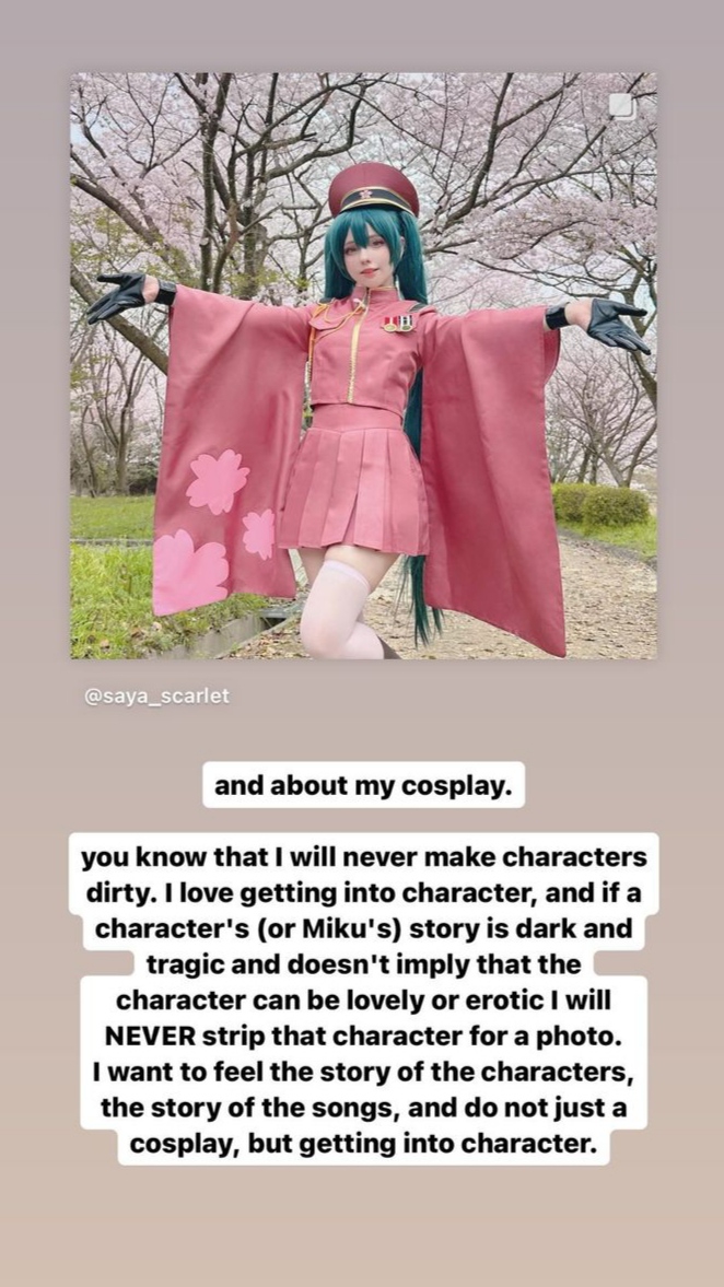 Мне было бы глубоко похуй на жиры Саи, если бы она не косплеила изначально худых по канону персонажей - Чии, Мику, Сая из новеллы, они же тощие и хрупкие все. А ей какая-нибудь не совсем худая Мадока бы подошла, или сиськи сделать и любую шлюху с выменем изображать, косплееры-поросята вполне себе живут и симпов имеют, если правильные образы выбирают.