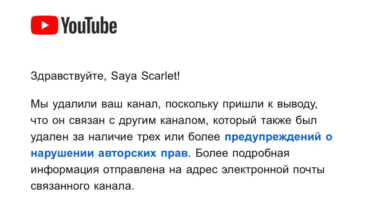 Мне нравится вот это «мы пришли к выводу и решили» Обычно страйк кидают (и обычно их 3 штуки сначала) а тут мой канал удалили ни за что, на моих видео не было ни единого страйка, ни одного сообщения от ютуба и с каким каналом связан мой канал (которому 15 лет уже) я понятия не имею лол Ну короче локти не кусаем, в поддержку уже написала, думаю восстановят все, потому что потерли тупо ни за что
