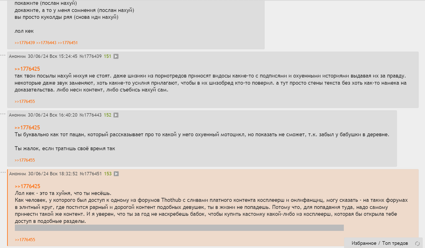 >>1776425 Лол кек - это та хуйня, что ты несёшь. Как человек, у которого был доступ к одному из форумов Thothub с сливами платного контента косплеерш и онлифанщиц, могу сказать - на таких форумах в элитный круг, где постится рарный и дорогой контент подобных девушек, ты в жизни не попадешь. Потому что, для попадания туда, надо самому принести такой же контент. И я уверен, что ты за год не наскребешь бабок, чтобы купить кастомку какой-либо из косплеерш, которая бы открыла тебе доступ в подобные разделы. И да, у Широ нет фоток с пиздой, из 18+ с ней только влажные истории о ебли на вписках, достоверность которых под сомнением