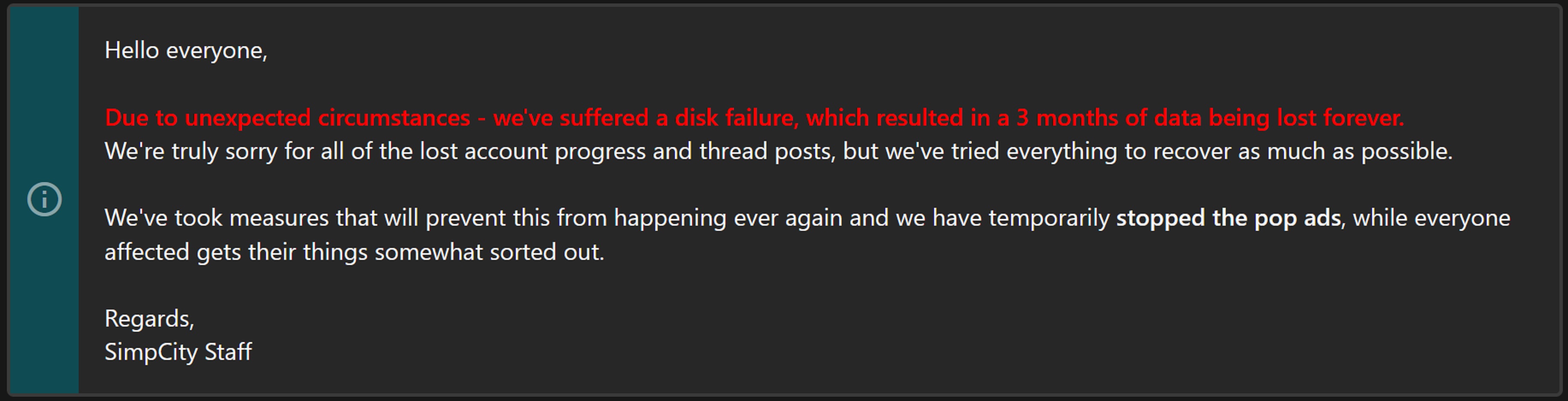>>1776640 Вот пиздец, теперь они легли с пометкой indefinitely until. Бразильяно дегенератос было настолько сложно сделать бэкапы форума не хостящего контент?