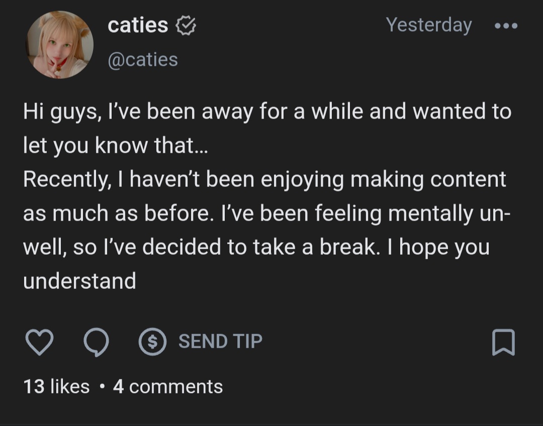 In this girls case, I wouldn't rule out grooming of some kind. She started posting artsy stuff, artistic modeling, and tiktok skits as early as 2014, when she was barely 15. Then in 2021 met some individual(s), traveled to a few countries, during covid lock downs. And completely changed to doing erocosplay and created her Onlyfans and Fansly. As far as her mental state or the mental state of any of these girls. Just look at the comments here on dvach. How much of that shit do you think they see every day in their dms and comment sections. Caties in particular can't post anything on her socials with out some faggot or old hag degrading her about how young she looks and that she is catering to pedofiles. Even the wording of some of her promos that were posted by her, not her agency, shows that she sees that shit in her dms. Some.of these girls need to realize that they may not be cutout for this kind of get rich quick work scheme. The smart ones atleast k ow when to take a break...