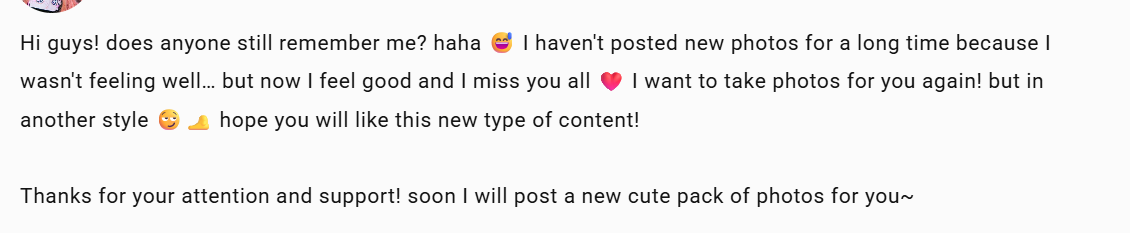 >>1805401 Нету сисек. И на своем фансли написала, что это будет фут-фетиш контент. Ничему не учится, все хочет на двух стульях усидеть и денги грести с дрочеров и не показывать им ничего. Любит на одни и те же грабли наступать - пожалуйста.
