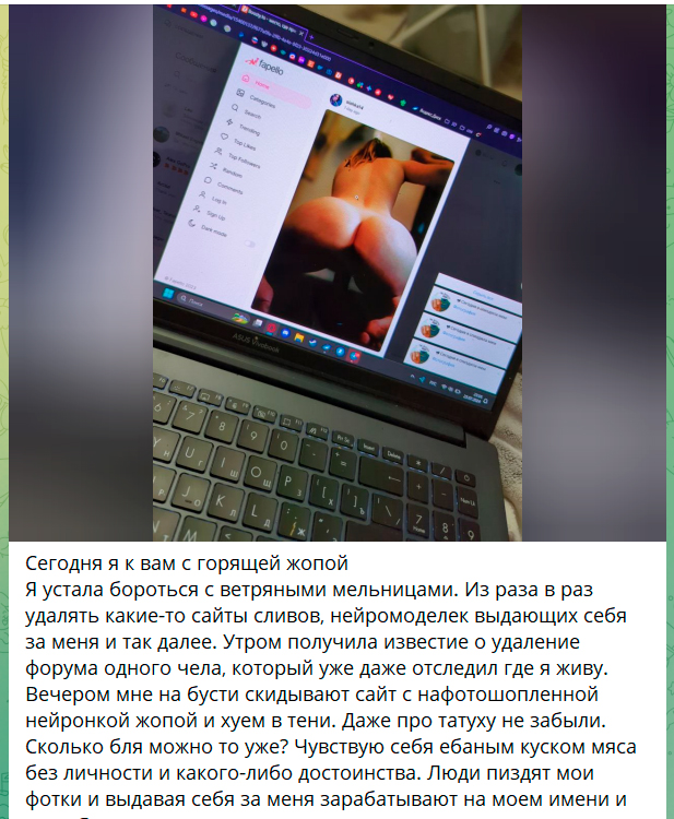 но вопрос интересный. она - никто, чтобы кто-то заморачивался и делал с ней дипфейки. напрашивается мысль, что она делает их сама, чтобы в телеге продавать. Нужно в этом вопросе разобраться