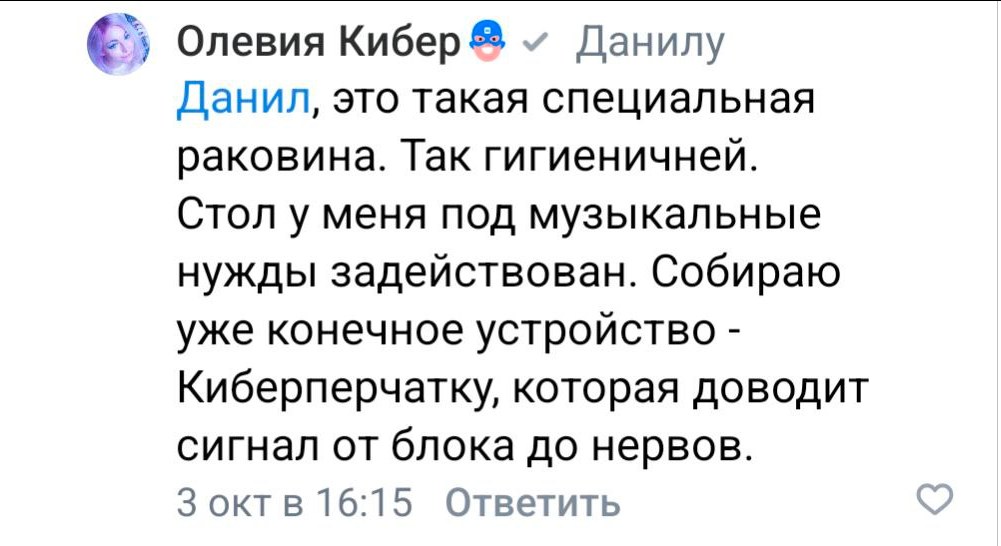 "Рука висела как плеть! Врачи убийцы сказали что двигаться она не будет! Но случилось чудо и я изобрела себе перчатку которая волшебным образом исцелила меня" это хуита какая то. Но я нихуя не удивлен, что кибердауны и это киберговно съели и не жаловались.