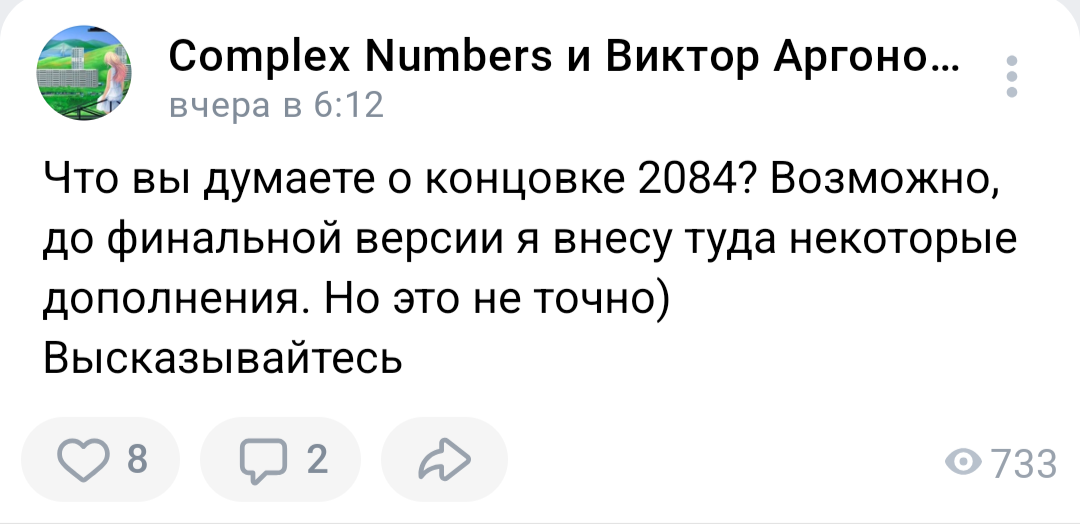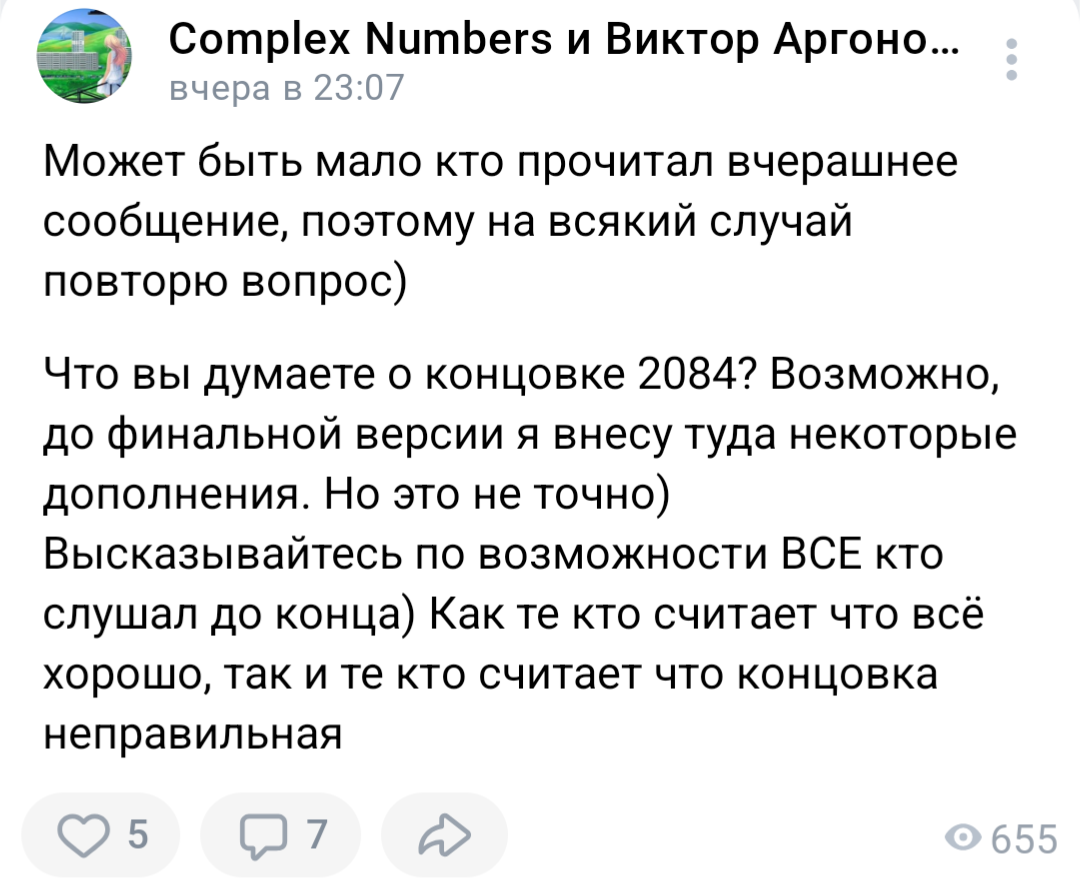 >>1784141 >>1784143 >>1784148 >>1784164 >>1784165 >>1784132 Я с большим уважением отношусь ко всем и мнению каждого, я не понимаю откуда столько агрессиик людям не с того не с сего. Вот вы же меня даже не знаете, а Виктора Аргонова знаете, но всё равно получается так как получается. Я думал о том как в детстве мы все смотрим на звёзды и мечтаем о других галактиках, но все же о чём то мечтают ну в разном конечно объёме и сила тоже они думают, встречается разное миропонимание, и почему же, это должно мешать нам понимать друг друга? В "2084" поднимается вопрос сосуществования разных систем и обобщения с помощью ИИ наших умов. Это отголоски мыслей об ускорителе, глобальном кольце, всеобщее прозрения в какие то понятные только избранным открытия. Я не хочу ссориться и не хочу никого обижать тоже не хочется, хочется понять почему вы так злые и сердитые на то, что не понимаете? Вот почему это имеет значение, если оно бессмысленное и вы сами это понимаете, но я просто не понимаю! Олевия прекрасно поёт, её голос помогает избавиться от волнения и помогает лучше постигать научные мысли Виктора Аргонова, зашифрованные им в техно опере. Я с большим уважением отношусь к его песням и песням Олевии особенно тоже очень с большим уважением отношусь. На стримах устойчивая атмосфера с пониманием и искренностью, такое невозможно подыграть, и смысл в словах очень большой, большое осмысления. Они опережают сознание.