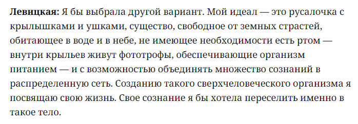 В остальном до идеала Оле всё ещё далеко: >Свободная от земных страстей Ебется с людьми рожает выблядков сидит на даче и просит соточек, вниманиеблядь >Не ест через рот Левицкая присосалась к Мухину и Фомину и питается свежим белком