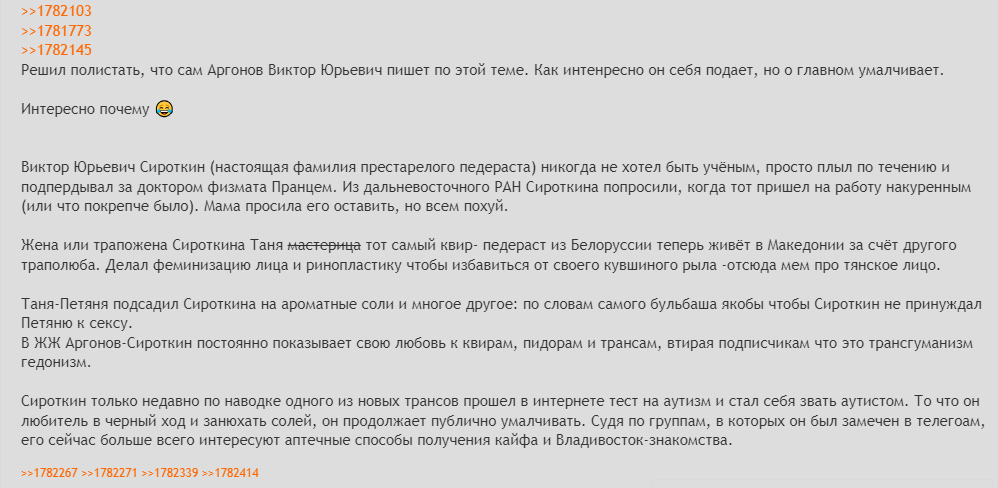 Аргонов дегенерат. Но тут скорей энцефалопатия и долгая долбёжка разжижила мозговое вещество Виктора нежели общая тупизна. Проблема не в том что он не включает мозг, проблема в том что он лет 15 так и пиздит про пользу микродозинга, мало осмысливая. Даже в кругу своих он главный клоун. А вот адекваты начинают спрашивать вопросы со звёздочками и становятся Ариельбами.