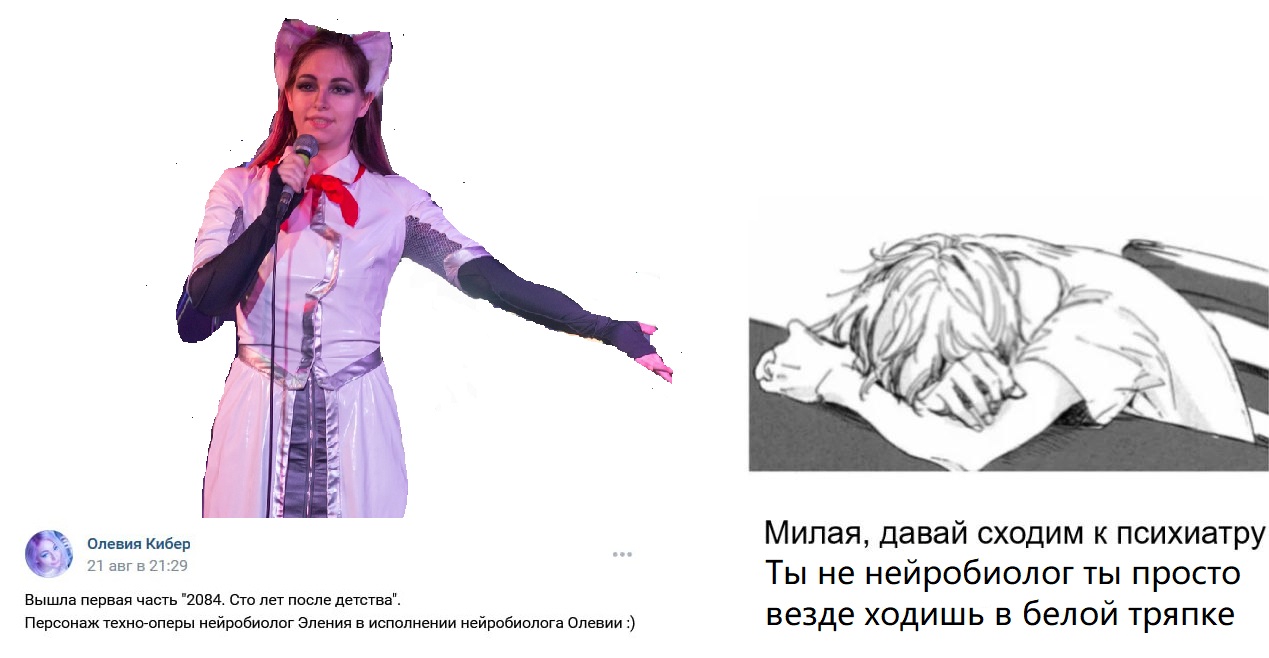 Олевия Кибер антиреклама киберкостюма, который просто гидрик и косплей. Виктор Аргонов антиреклама биохакинга веществами.