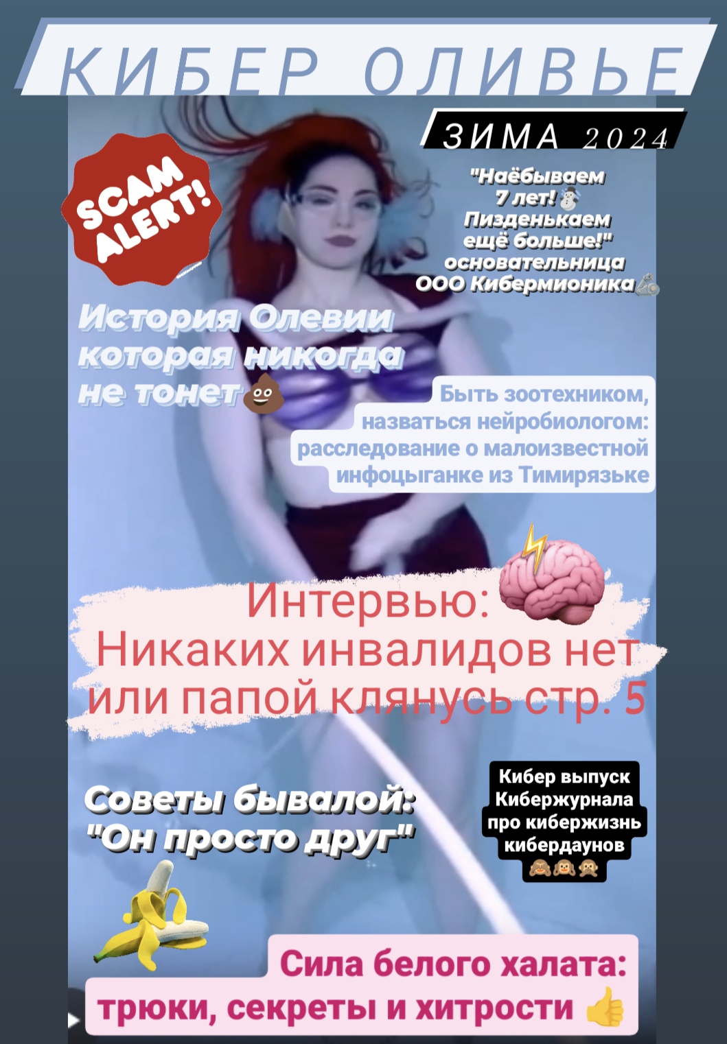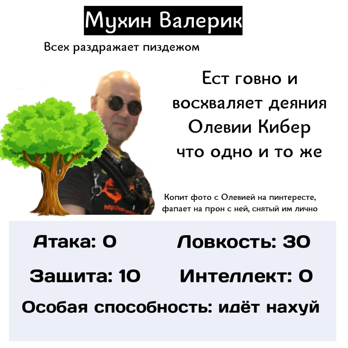 Кибердура так и ходит везде в потнике, верит, что он ей помогает, не похудела к сентябрю как обещала и воняет. Мухин вписался быть Олиным представителем, носится с Говневией решать ее вопросы, потому что на пенсии скучно, а Оля за это соснёт в бассейне.