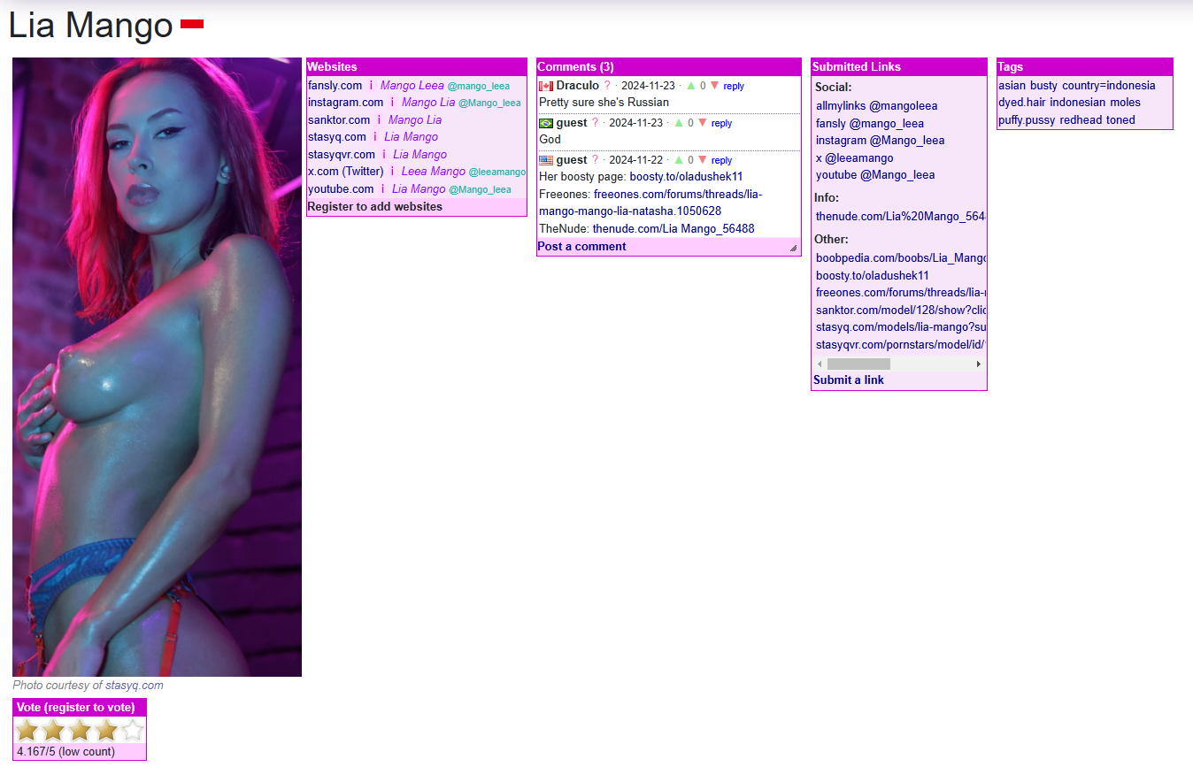 Изначально она назвалась другим именем, чтобы разделить свою эротическую и косплейную личности и, скорее всего, чтобы в ру-сообществе о её откровенных съёмках никто не знал. Но затем она зачем-то начала сниматься для эросайтов, на сливы с которых обязательно наткнётся кто-то из российских подписчиков. А теперь у неё ещё и страницы на всех модельных агрегаторах и даже на xvideos.