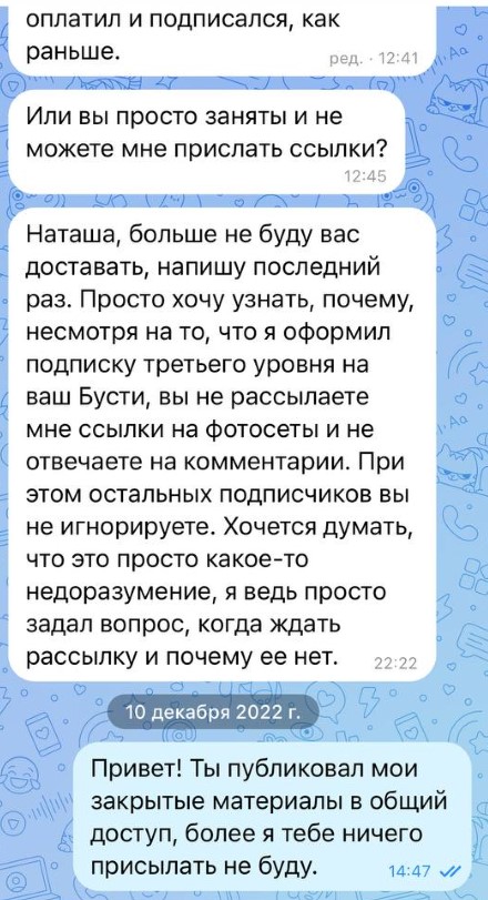 Натаха совершенно не уважает подписчиков на Бусти. Предлагать такое за 30 баксов, в то время как за 20 баксов можно подписаться на Фансли и получить намного больше, это верх развода. Спасибо чуваку, который слил это, но мне очень жалко, что он потратил на это свои деньги.