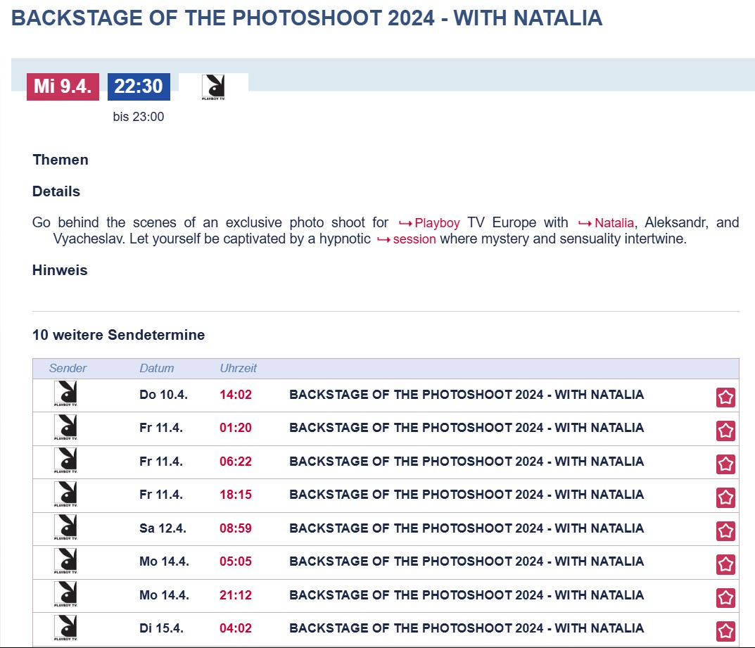 В российском вещании Наталии нет вообще и там, по странному совпадению, все две недели идёт передача backstage with Kima. Может ли у нашего канала более достоверное расписание, чем у европейского? Хуй знает.