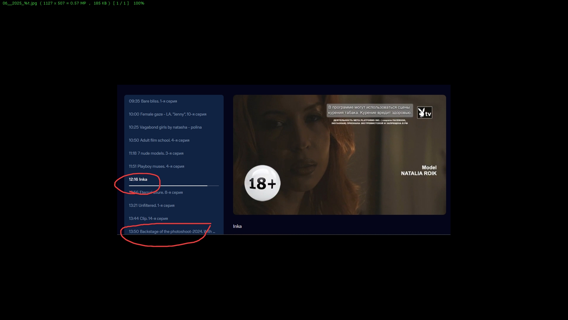 >>1798124 Трейлер находится только по поиску, а поиск доступен только при условии, что ты неправильно введёшь адрес страницы и сайт предложит тебе поискать что тебе надо. Нигде на главной странице анонса с Наталией нет. Чувак с сайта со сливами, который до этого все видосы с канала публиковал и явно имеет доступ к европлейбою, тоже пишет, что ролика не было в эфире. А насчёт отметки Россия 18+, то это хз что. Но трансляция явно не российская - там различаются как расписание, так и сам значок плейбоя в правом верхнем углу. Так что с большой вероятностью - это на самом канале накосячили ну или у них потребовали не пускать ролик в эфир. Хотя хз как на это может кто-то повлиять, раз его уже отсняли и продали.