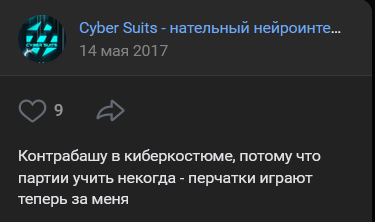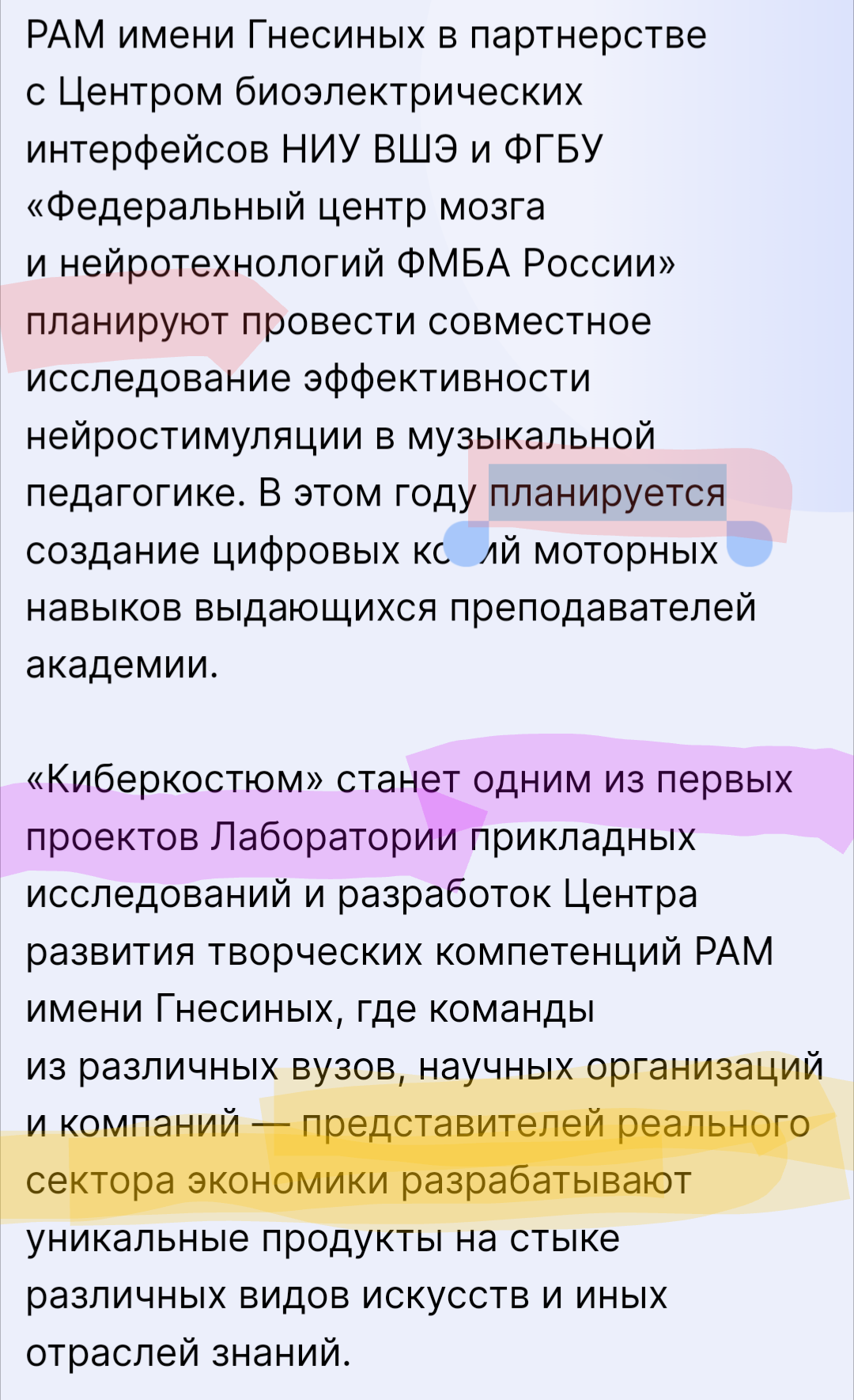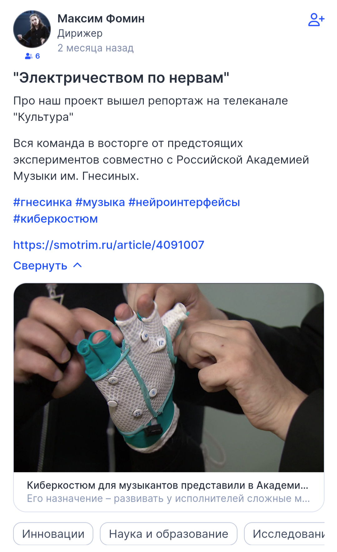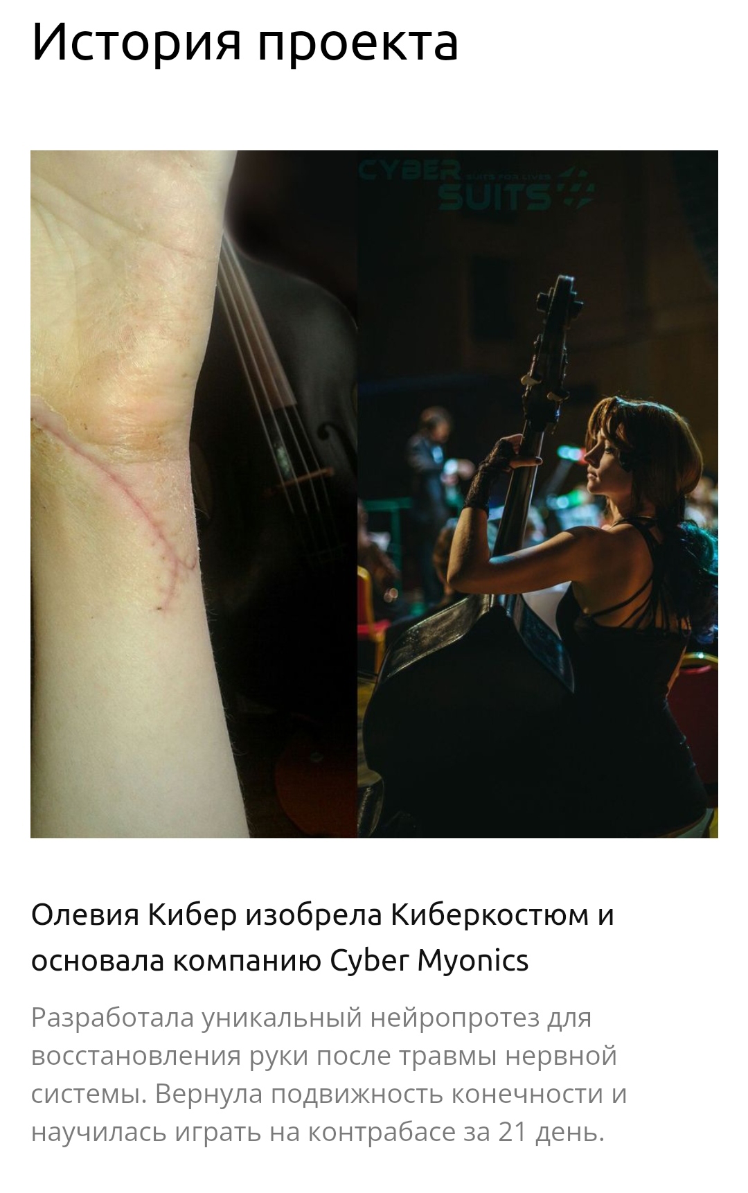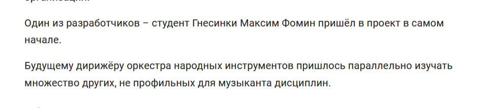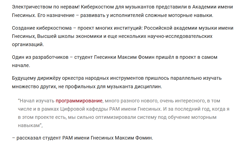 Источник: https://www.classicalmusicnews.ru/news/kiberkostyum-dlya-muzykantov-predstavili-v-akademii-imeni-gnesinyh/ >>Начал изучать программирование, много разного нового, очень интересного, в том числе и в рамках Цифровой кафедры РАМ имени Гнесиных. И за последний год, когда я в этом проекте есть, мы сильно оптимизировали систему под обучение моторным навыкам >>Сфера применения “нательного нейроинтерфейса”, а проще – киберкостюма, потенциально безгранична: благодаря системе генерации электрических нервных импульсов это восстановление и реабилитация после травм, коррекция веса и физических недугов. >>Непосредственно для музыкантов – инструмент для развития мышечной памяти. Профессионалам – как тренажер для улучшения технических возможностей. Новичкам киберкостюм поможет сразу же выстроить необходимые для игры моторные навыки.