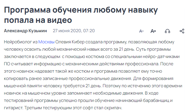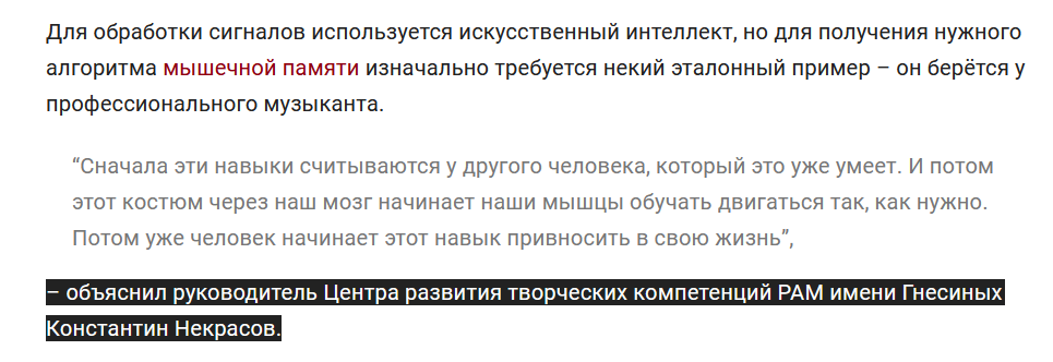 >>Для обработки сигналов используется искусственный интеллект, но для получения нужного алгоритма мышечной памяти изначально требуется некий эталонный пример – он берётся у профессионального музыканта.