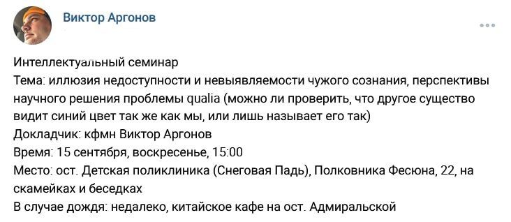 >>1785056 Один из научных семинаров Виктора Аргонова во дворе его дома по улице полковника Писюна, куда не пустили бывшую вокалистку Вероничку потому что та не в теме такой философии на лавках. Выводы?