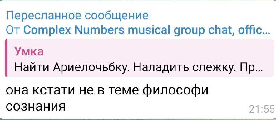 >>1786181 Если эти посты пишет Аря, то я совсем разочарован. Хотя русалочку продолжу слушать. А мозг певички похоже реально дал трещину, что единственное его применение - делать скриншоты переписок без дат и делать нихуя непонятные фотожабы.