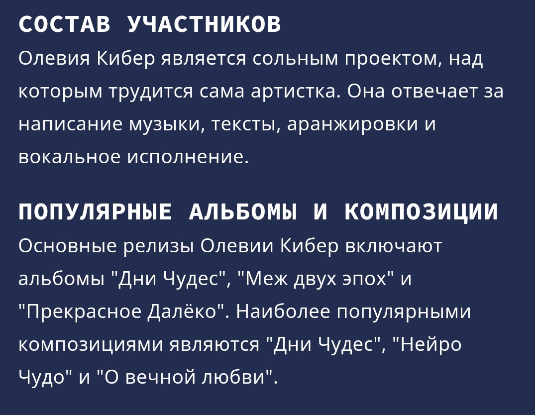 >Олевия Кибер является сольным проектом, над которым трудится сама артистка. Она отвечает за написание музыки, тексты, аранжировки и вокальное исполнение. >Основные релизы Олевии Кибер включают альбомы "Дни Чудес", "Меж двух эпох" и "Прекрасное Далёко". Наиболее популярными композициями являются "Дни Чудес", "Нейро Чудо" и "О вечной любви".