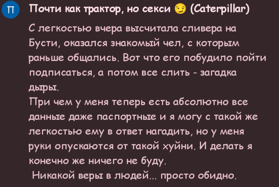 Если что, пишу тут без мысли кого-то задеть или обидеть, без затеи поругаться. Просто зацепила тема, стало интересно. Считаю, что анон прав, учитывая то, что он ведет кого-то уже и общается с кем-то из обсуждаемых (если не гонит). А так, что вам судить, что мне, чисто по одному примеру личному глупо.